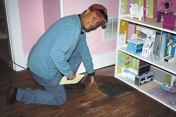 Al Hunter uncovers the hole where the stovepipe went through the floor.